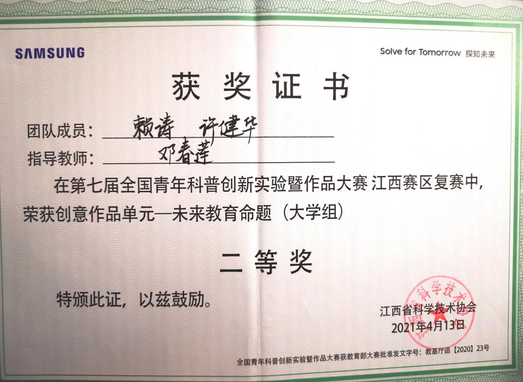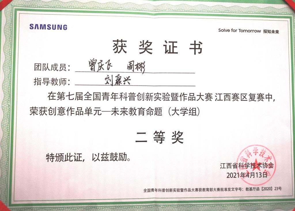 4月13日,我院青年教师刘康兴、邓春莲共同指导四名学生的两个作品包揽“第七届全国青年科普创新实验暨作品大赛江西赛区复赛”未来教育(大学组)二等奖。