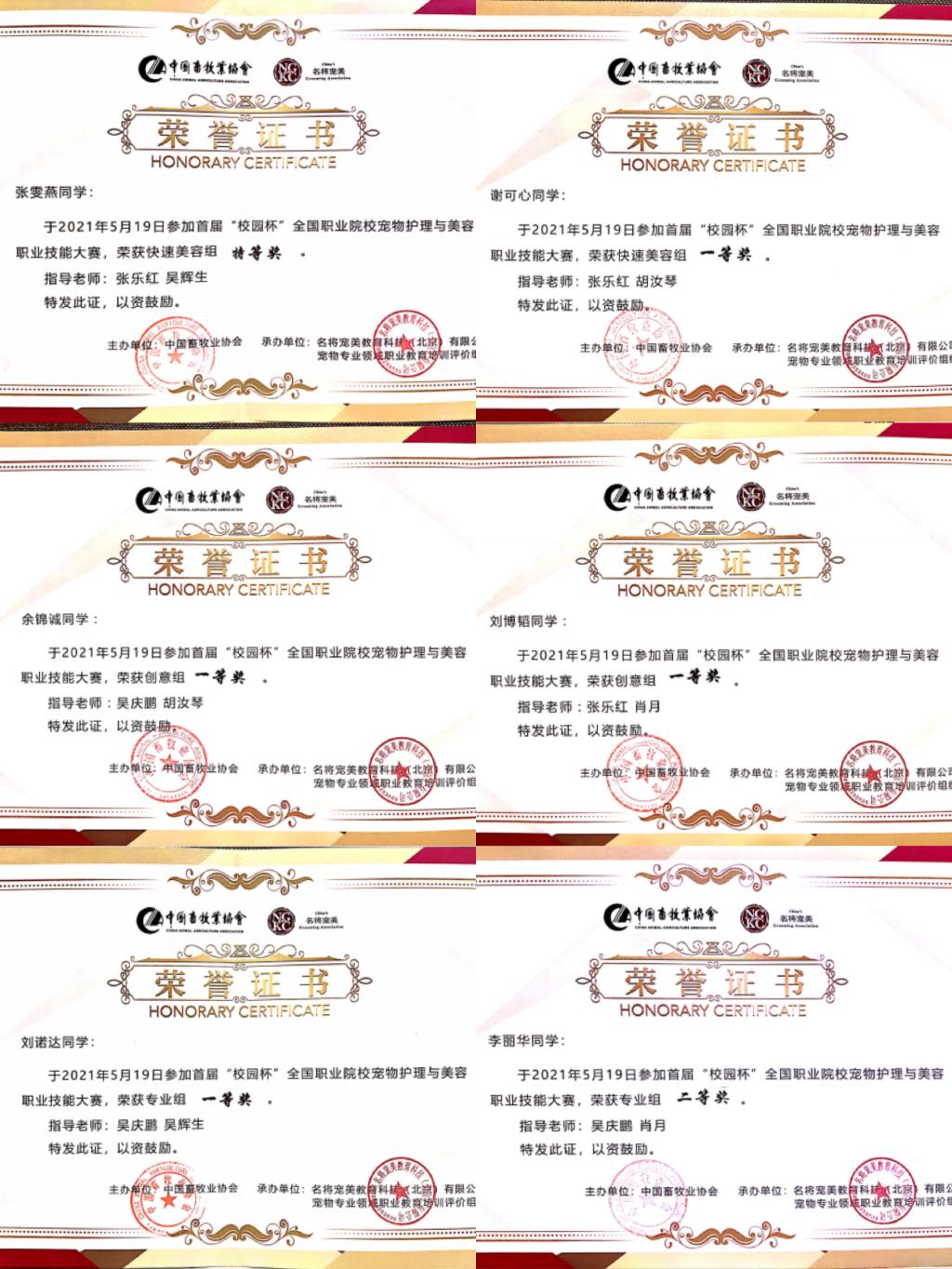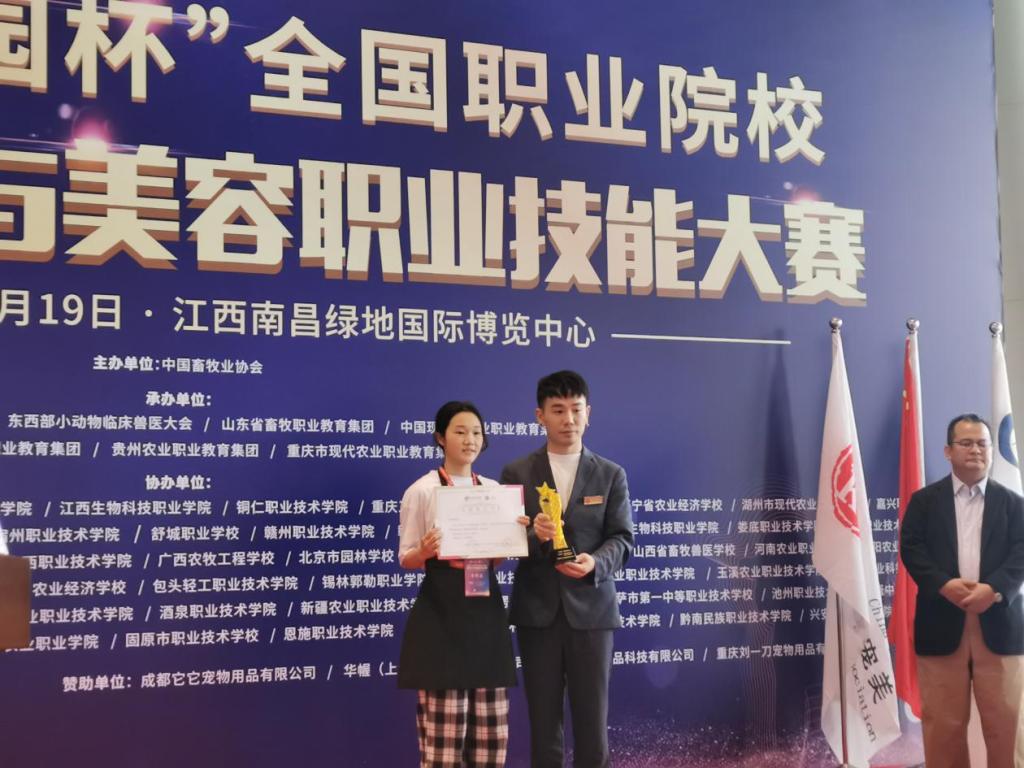 5月19日,首届“校园杯”全国职业院校宠物护理与美容职业技能大赛在江西南昌绿地国际博览中心隆重举行,来自全国49支高职院校代表队、225名选手参赛。我院动物科学系派出六名选手参赛,同学们面对众多选手不畏强手、沉着应对、顽强拼搏,最终2020级畜牧兽医专业的张雯燕获得快速美容组特等奖,刘诺达、刘博韬、谢可心、余锦诚获得一等奖,李丽华获得二等奖。学院获得优秀组织奖。
